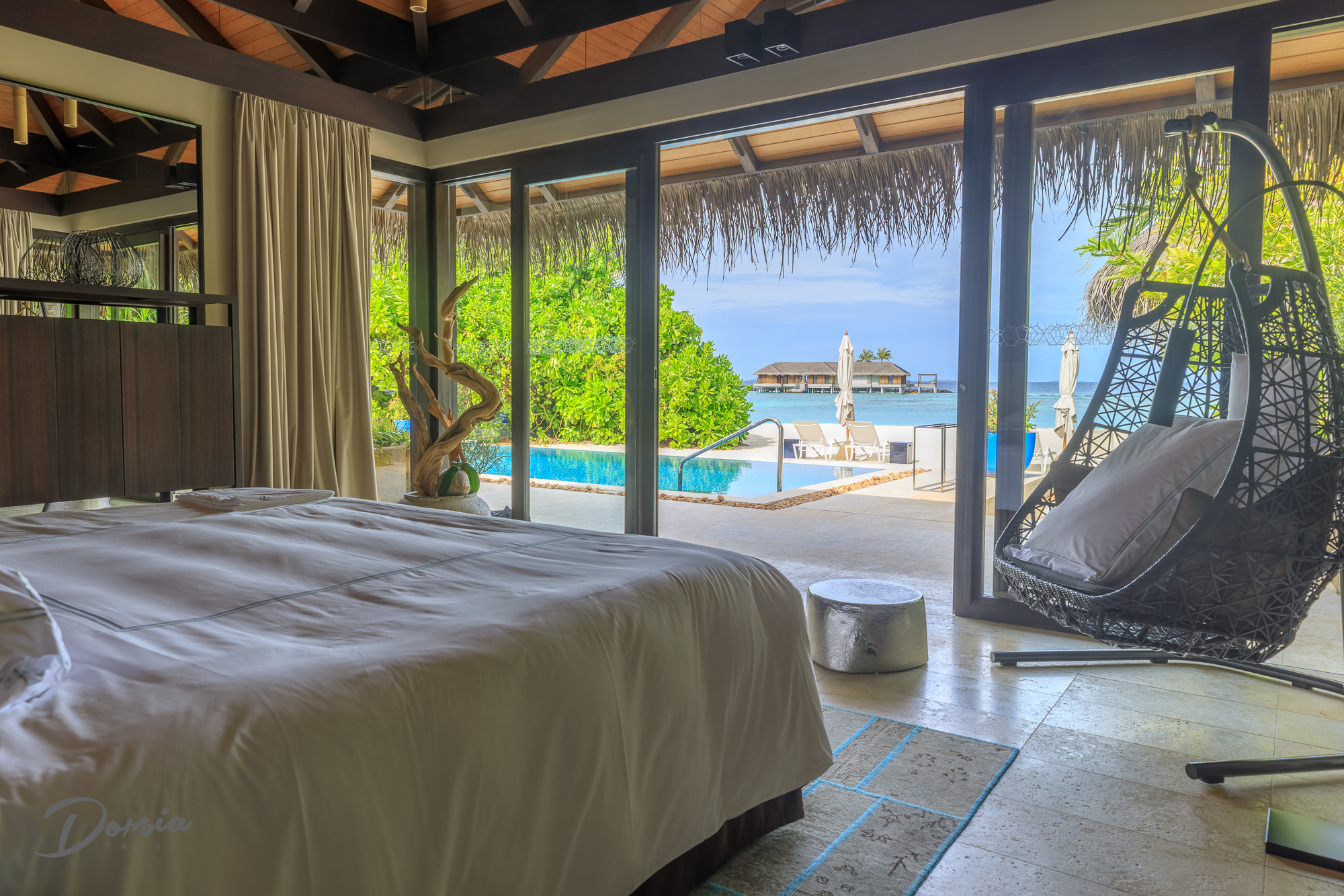 Bedrooms blend light and privacy using louvered wood, natural materials and lights suspended from high vaulted ceilings. Rattan swinging chairs add a sense of fun to the elegant décor. Outside, there is a spacious terrace with a large private pool, carefully positioned day beds and a standalone outdoor dining platform which offers panoramic views of the lagoon.